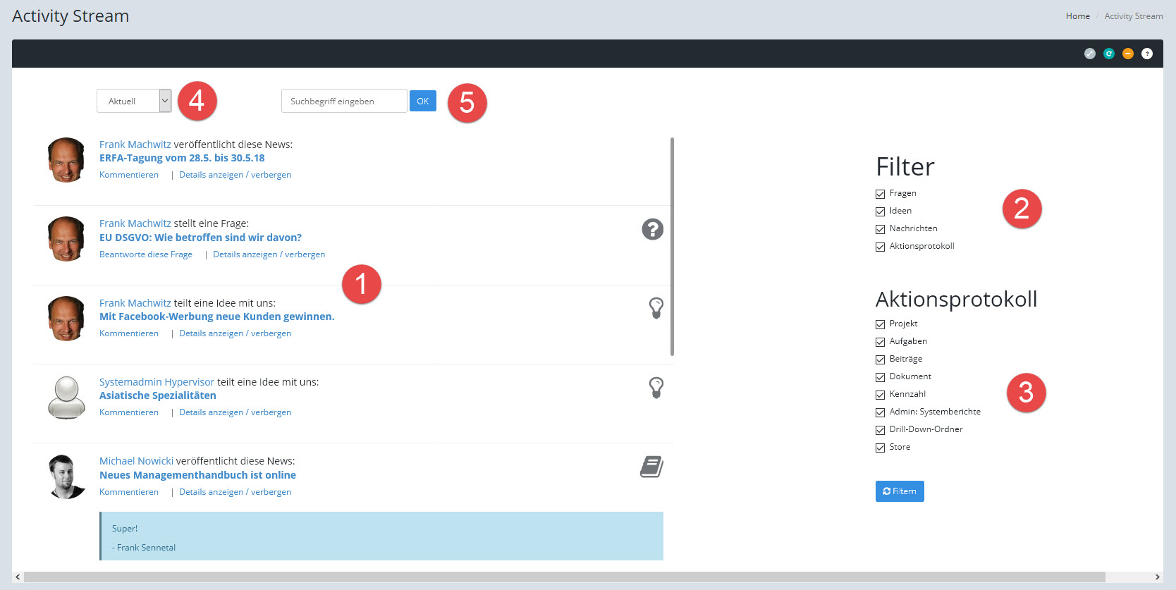 Im Activity Stream werden Nachrichten, Fragen und Ideen publiziert und ausgewählte Aktivitäten und Ereignisse protokolliert: