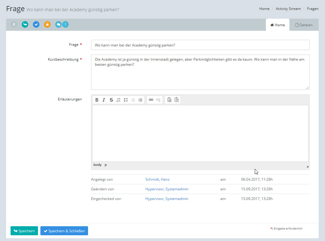 In diesem Feld wird angezeigt, wer das aktuelle Objekt erstellt, zuletzt geändert und zuletzt eingecheckt hat. Sie können die angezeigten Namen anklicken, um die Profilseite des Users aufzurufen. |