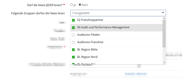 Wenn Sie hier "Nein" auswählen, müssen Sie über die Objektberechtigungen explizit festlegen, wer diese News lesen darf. Sie können dann ankreuzen, für welche Benutzergruppen die Nachricht sichtbar sein soll: