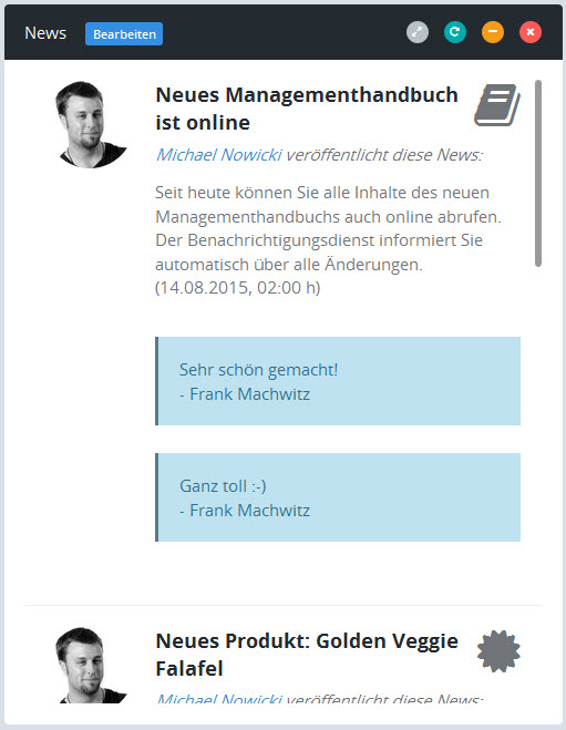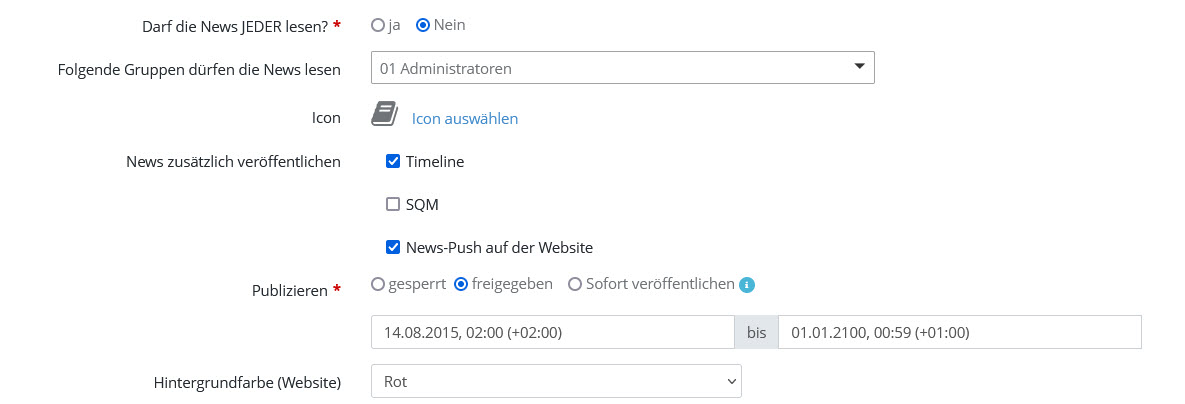 Freigegeben: zeigt die Nachricht an gesperrt: zeigt die Nachricht nicht an (weder im Newsbereich, noch in der Timeline) Sofort veröffentlichen: Die News wird sofort veröffentlicht und alle Leser werden sofort per E-Mail benachrichtigt, dass es diese neue News gibt. |