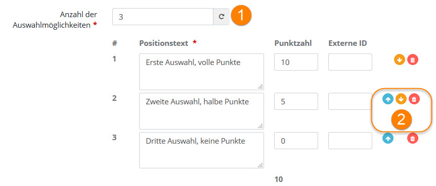 •Ranking-Fragen (wie bei Single Choice, wobei die erreichte Punktzahl automatisch anhand der ausgewählten Ranking-Stufe und der Anzahl der Ranking-Stufen berechnet wird)
