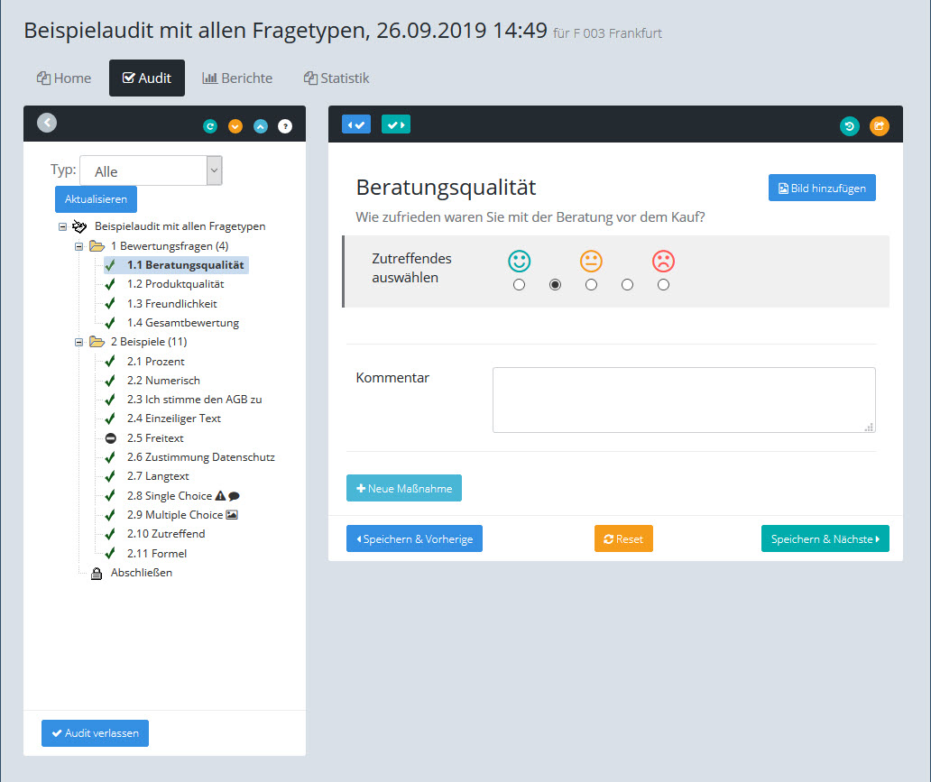 Die Bewertungsmöglichkeiten der Prüfposition werden bei der Definition des Audits vorgegeben. Die obige Abbildung zeigt z.B. eine Position vom Typ Single Choice. |