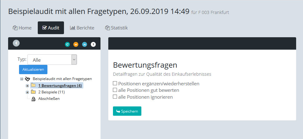 Mit Hilfe der Auswahlliste "Typ" können Sie die angezeigten Fragepositionen nach folgenden Merkmalen filtern: Offene (=unbeantwortete), Ignorierte, Mit Kommentar, Mit Maßnahmen.