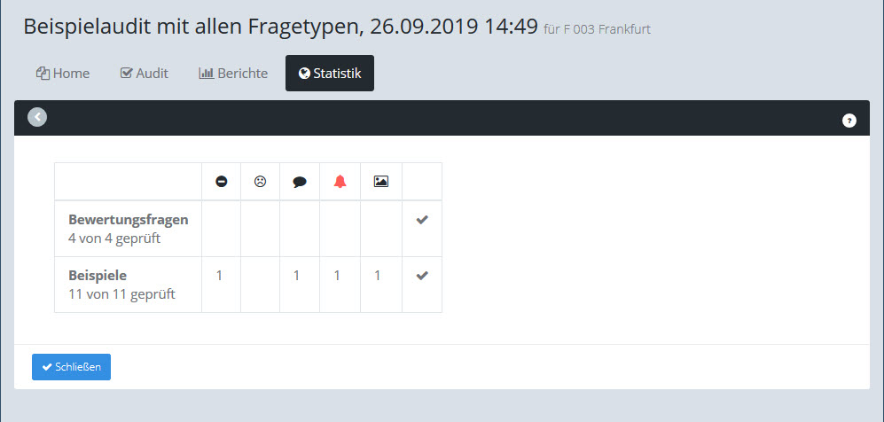 Der Statusbericht stellt das Ergebnis des Audits dar: