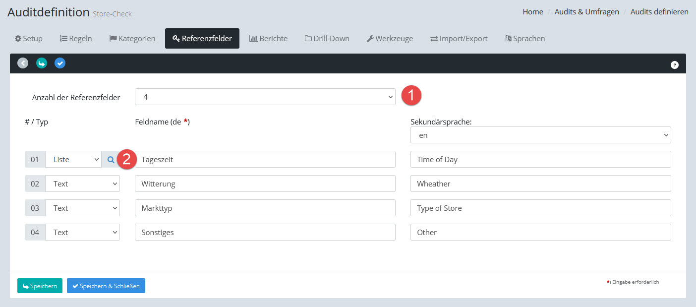 Referenzfelder sind frei benennbare Textfelder, die beim Audit erfasst werden können, um zusätzliche Informationen zu speichern wie z.B. Angaben zum Wetter.