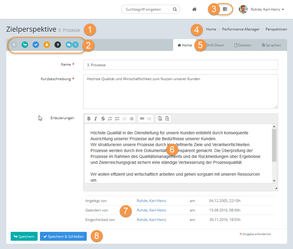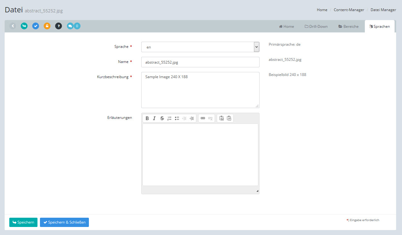 Die Bildschirme zum Bearbeiten der Daten (z.B. Beiträge, Dateien, Kennzahlen, etc.) sind alle ähnlich aufgebaut.