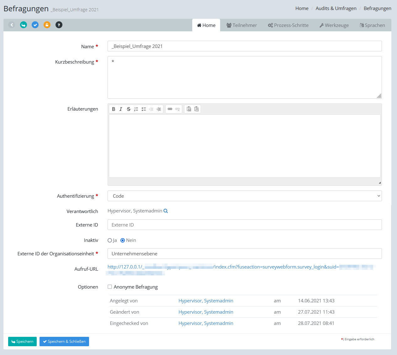 Befragung: Registerkarte Home (Stammdaten)