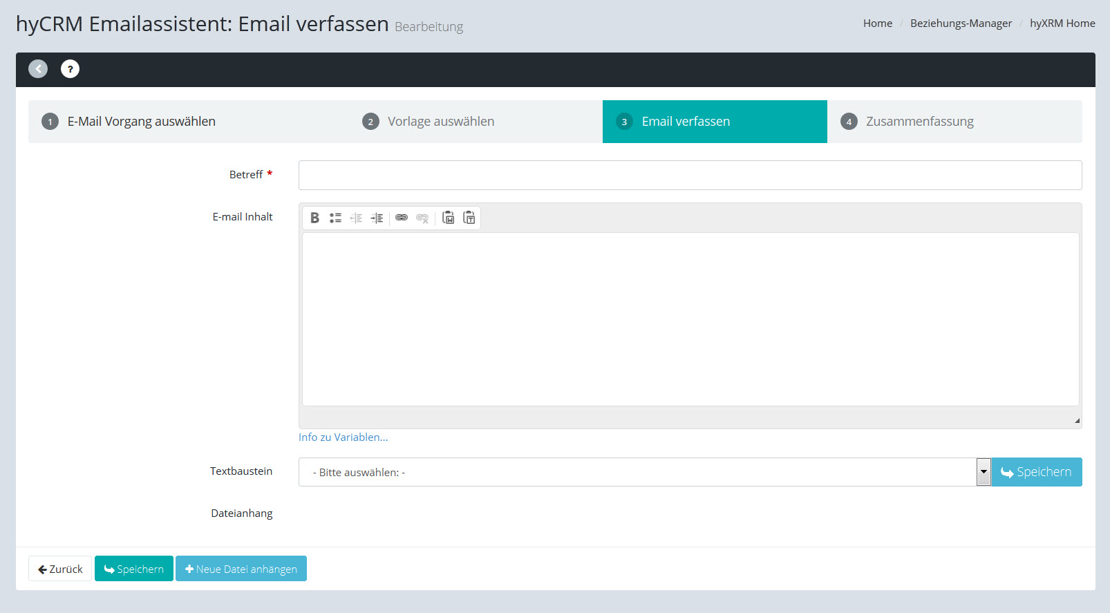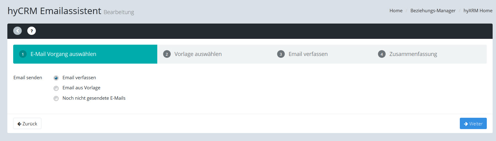 Nach dem Anklicken des Symbols "Neue Email" öffnet sich der hyCRM Emailassistent: