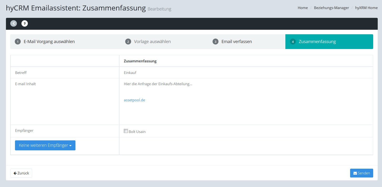 In der Zusammenfassung können Sie nochmals alle Daten und den Email-Text ansehen.
