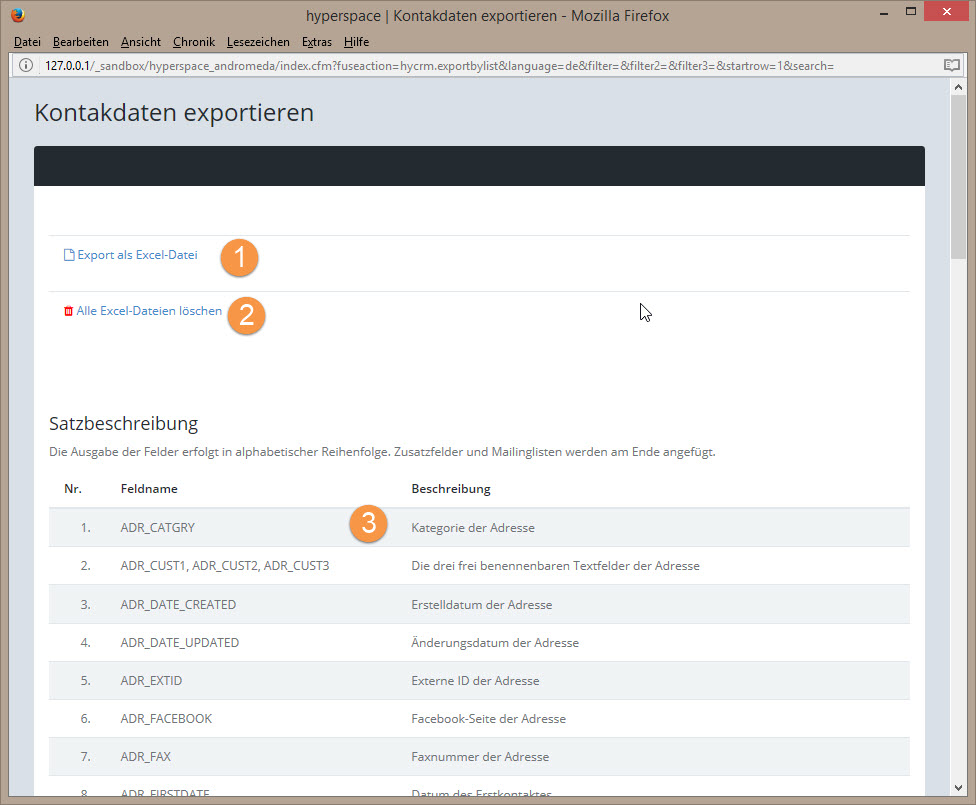 Mithilfe der entsprechenden Schaltfläche können Sie die Adressen und Kontaktpersonen aus hyperspace Dimensions als Excel-Datei exportieren.