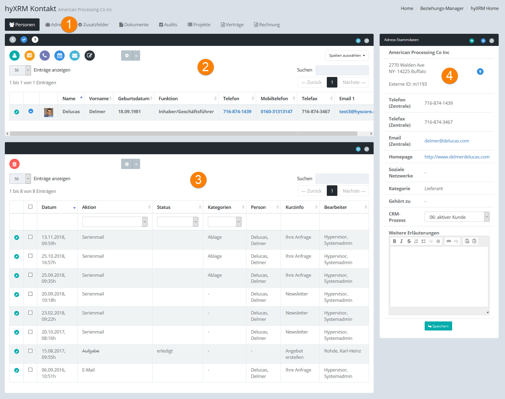 Ansicht der Kontaktdaten, der Ansprechpartner und der Historie
