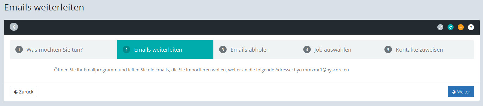 Öffnen Sie ihr übliches Email-Programm, wählen Sie die Emails aus, die Sie in hyScore importieren wollen und leiten Sie diese an die angezeigte Import-Emailadresse weiter.