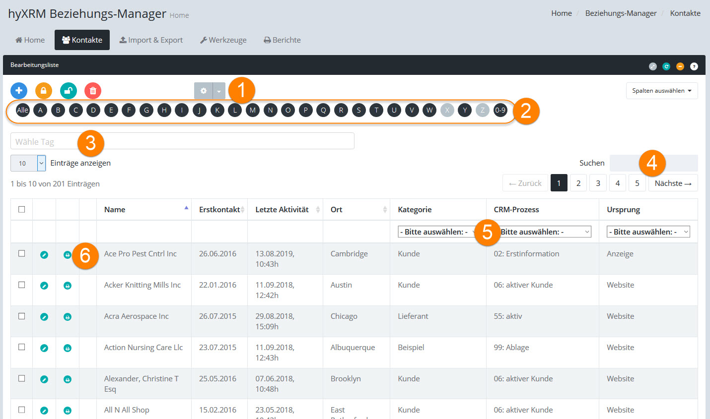Mit der Bearbeitungsliste der Kontakte können Sie Adressen suchen, bearbeiten und neue Adressen anlegen