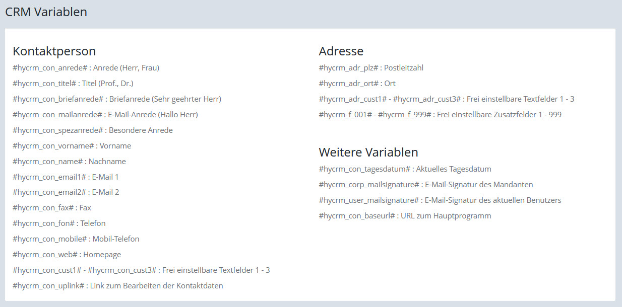 Beim Erstellen von Textbausteinen für E-Mail-Vorlagen, beim Versand von E-Mails aus dem CRM und beim Erstellen von Rechnungen können Sie zahlreiche Variablen als Platzhalter für Adressdaten und andere Informationen verwenden.