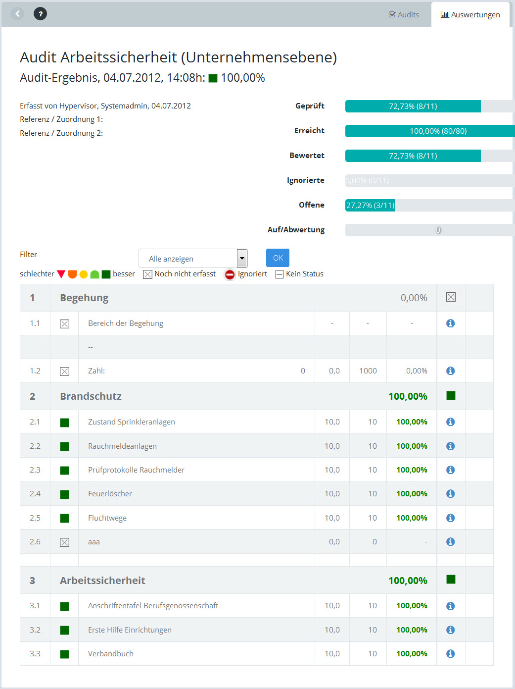 Durch Anklicken des Audits in der Scorecard wird die Auditübersicht angezeigt: