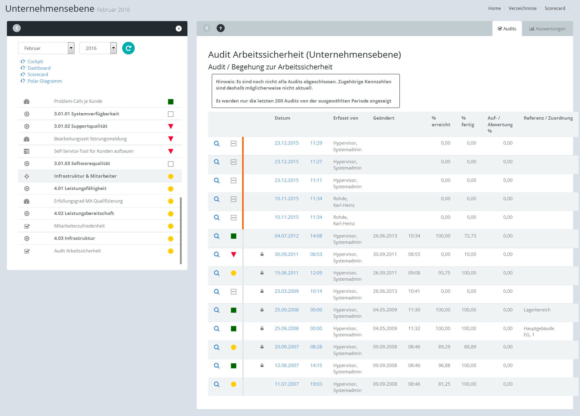 In den Scorecardansichten erscheinen Audits mit Name, Ampelfarbe und Zielerreichung in %:
