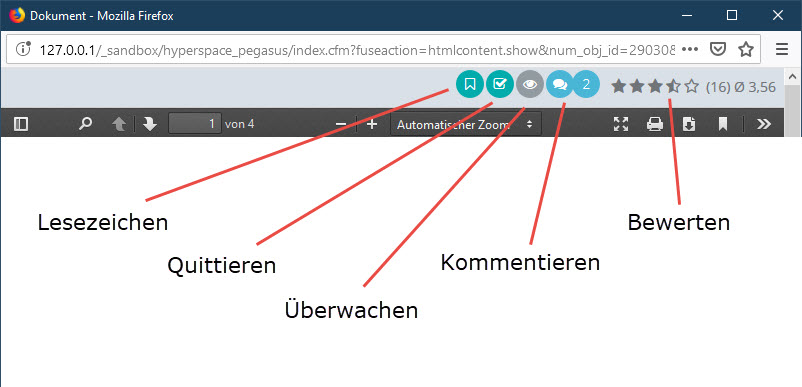 Mit Hilfe der Buttons und Schaltflächen in der Menüleiste können Sie das Dokument als Lesezeichen speichern, quittieren, überwachen, kommentieren oder bewerten: