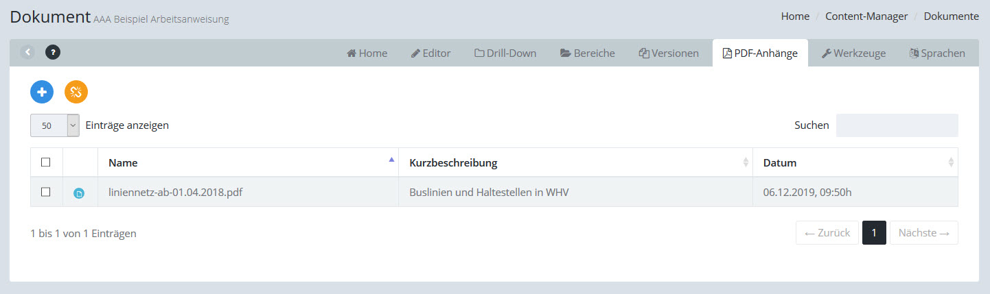 Klicken Sie auf den blauen (+) Plus-Button, um eine vorhandene PDF-Datei anzuhängen oder eine neue PDF-Datei hochzuladen.