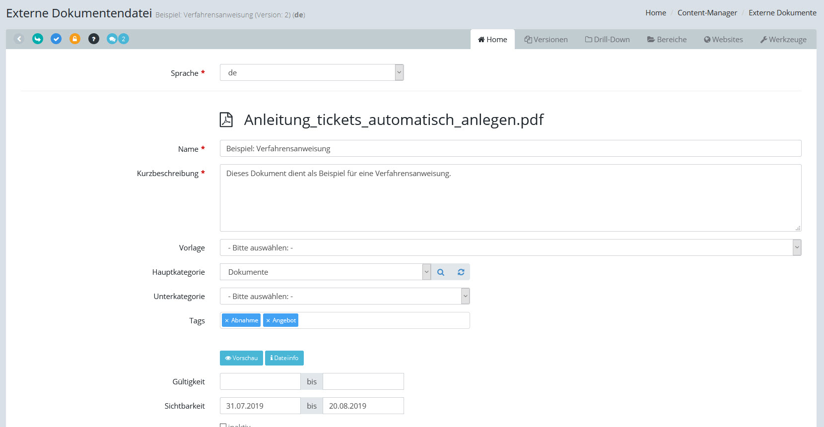 Grundlegende Auswahl der Sprache des aktuellen Dokumentes. Metadaten sind sprachunabhängig, aber Name und Beschreibung sind bei jeder Sprache unterschiedlich. Tags sind automatisch deutsch und englisch. |