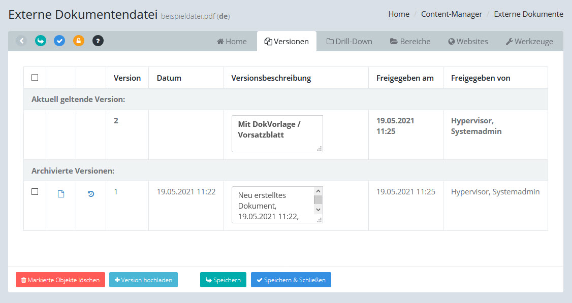 Durch die Schaltflächen [Makierte Objekte löschen] und [Version hochladen] können Sie ausgewählte Versionen löschen bzw. eine neue Version hochladen.