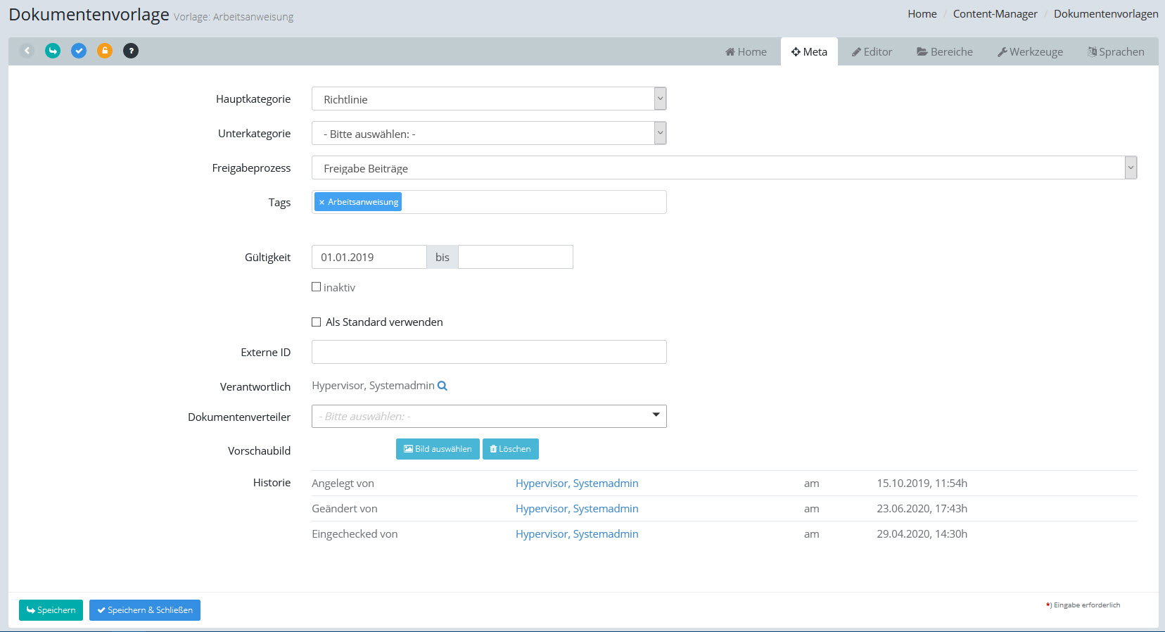 Metadaten, die Sie hier bei der Vorlage festlegen, werden beim Neuanlegen von Dokumenten mit dieser Vorlage in das Dokument übernommen und können dann dort geändert werden.