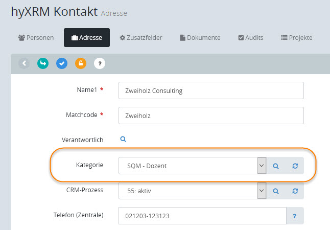 Damit das Programm eine Adresse als Dozent erkennt, müssen Sie "SQM-Dozent" als Kategorie der Adresse auswählen:
