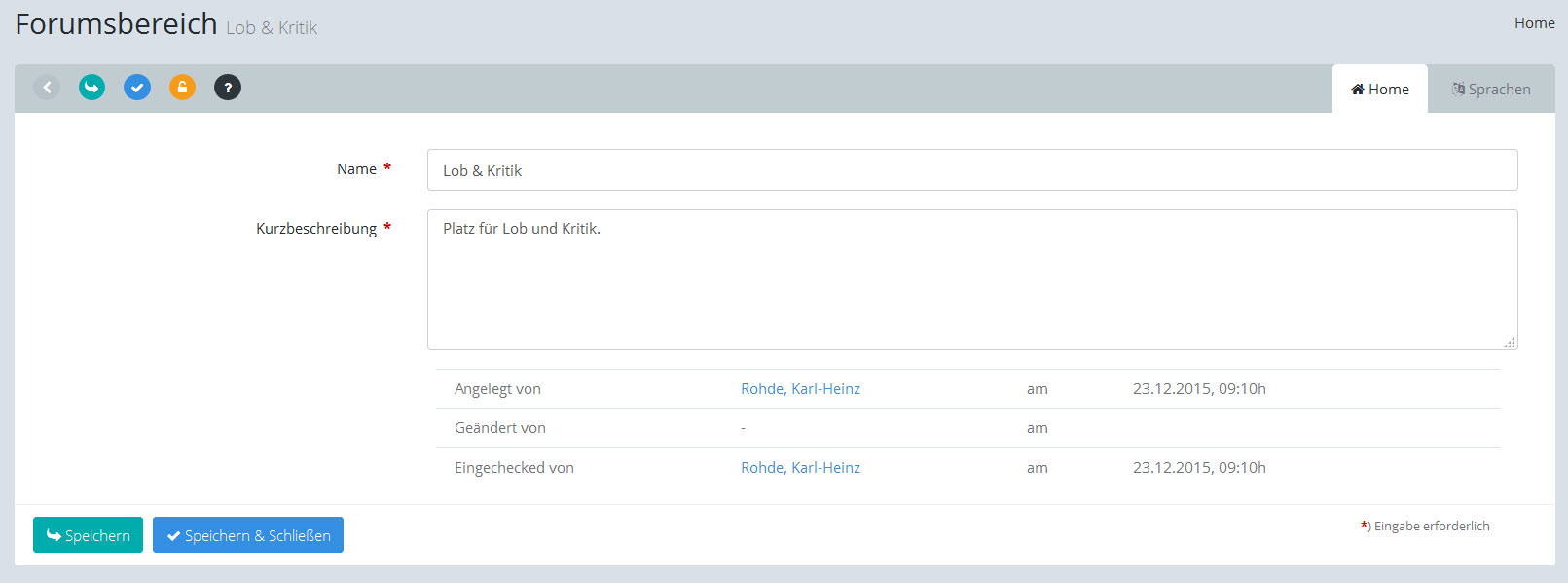 In diesem Feld wird angezeigt, wer das aktuelle Objekt erstellt, zuletzt geändert und zuletzt eingecheckt hat. Sie können die angezeigten Namen anklicken, um auf die Profilseite des jeweiligen Users zu gelangen. |
