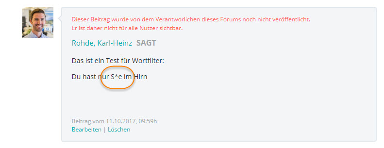 Beim Speichern des Forumsbeitrages werden Wortfilter-Ausdrücke dann durch ein Sternchen ersetzt: