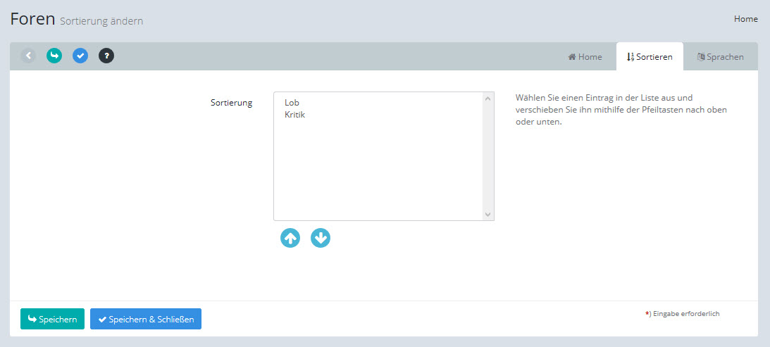In diesem Bildschirm können Sie die Sortierung der Foren innerhalb des aktuellen Forumsbereiches ändern, angezeigt werden die Geschwister der gleichen Gliederungsebene.
