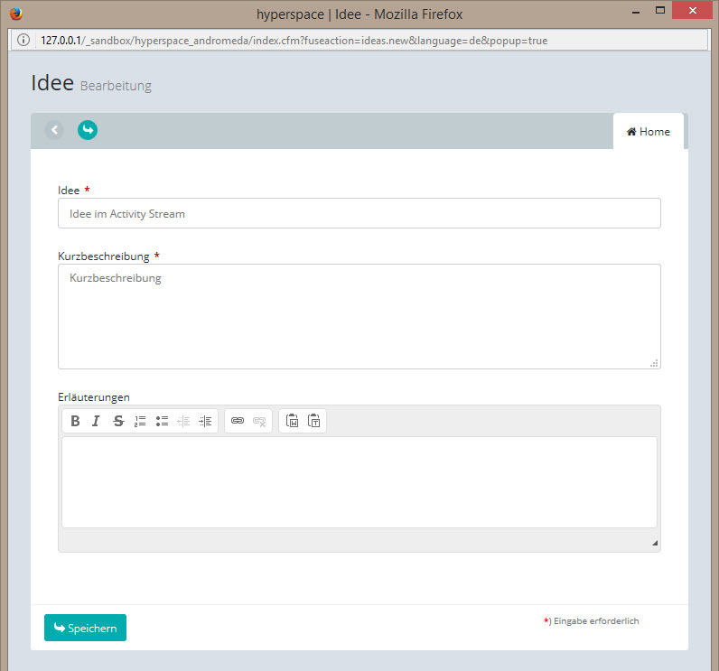 Klicken Sie dann auf [Speichern] um die Idee oder Frage zur Diskussion zu stellen. Sie wird dann im Newsbereich auf der Home-Seite angezeigt und kann von allen anderen Benutzern gelesen und kommentiert werden.
