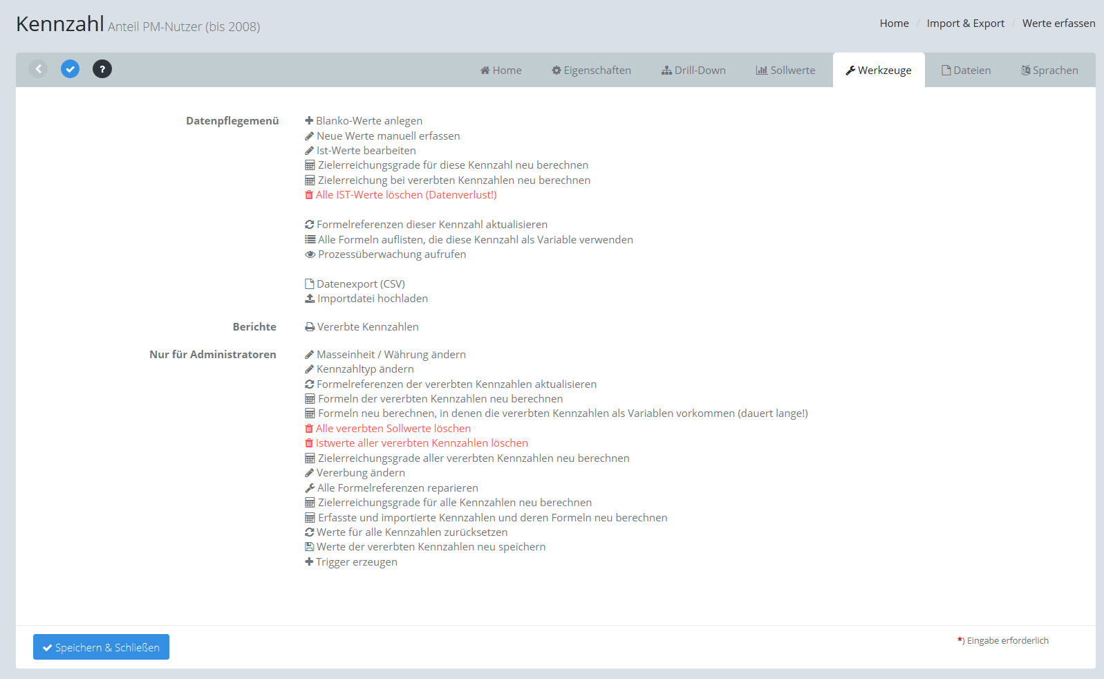 Auf der Registerkarte "Werkzeuge" finden Sie alle Wartungsfunktionen, die Sie für die aktuelle Kennzahl ausführen können. Welche Wartungsfunktionen Ihnen zur Verfügung stehen, hängt von der Art der Kennzahl und Ihren Berechtigungen ab.
