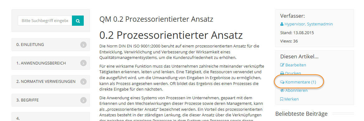 3.Die bereits vorhandenen Kommentare werden in diesem Bereich angezeigt. Der Text kann im Nachhinein nicht mehr verändert werden. Administratoren, der Verfasser des Kommentars und der Bearbeiter des zugehörigen Objektes können einen Kommentar jedoch löschen. Außerdem kann jeder Leser des Kommentars den Kommentar durch Anklicken der Symbole "Daumen hoch" bzw. "Daumen runter" bewerten, falls die Bewertungsfunktion freigeschaltet wurde.