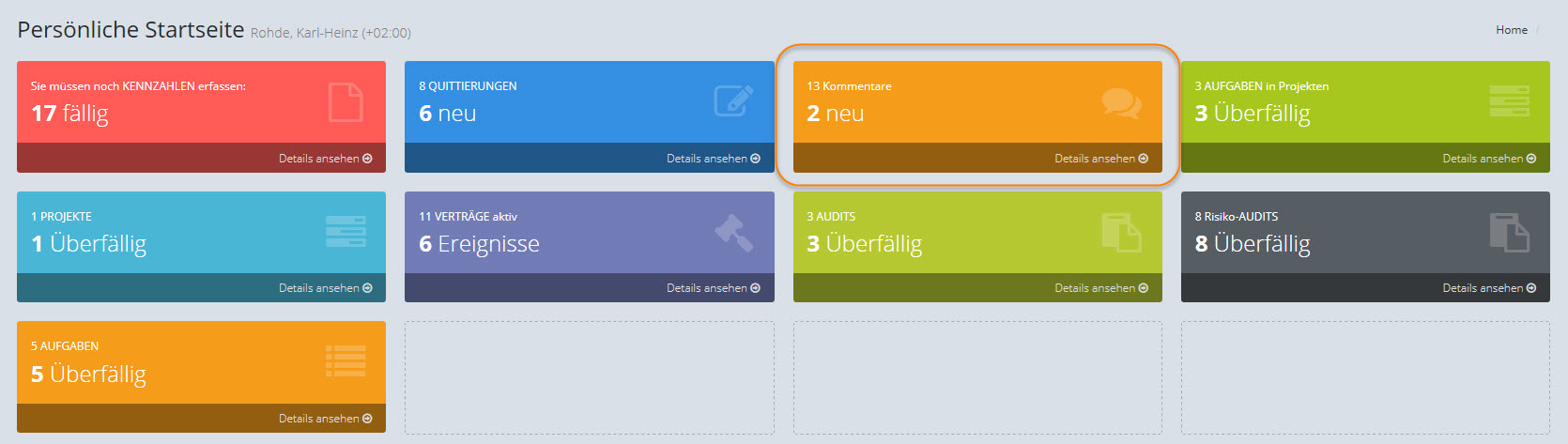 Der Verantwortliche Benutzer für ein Objekt wird automatisch per E-Mail und mittels Info-Kachel auf der persönlichen Startseite über neue Kommentare informiert.