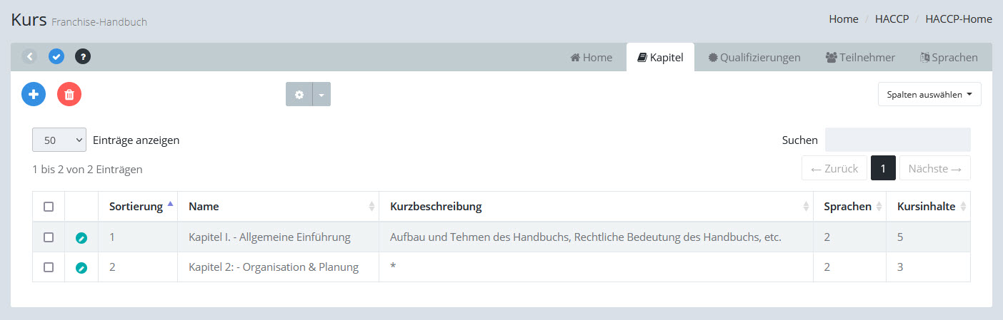 Die Bearbeitungsliste der Kurskapitel zeigt eine Übersicht der Kapitel und ihrer Inhalte.