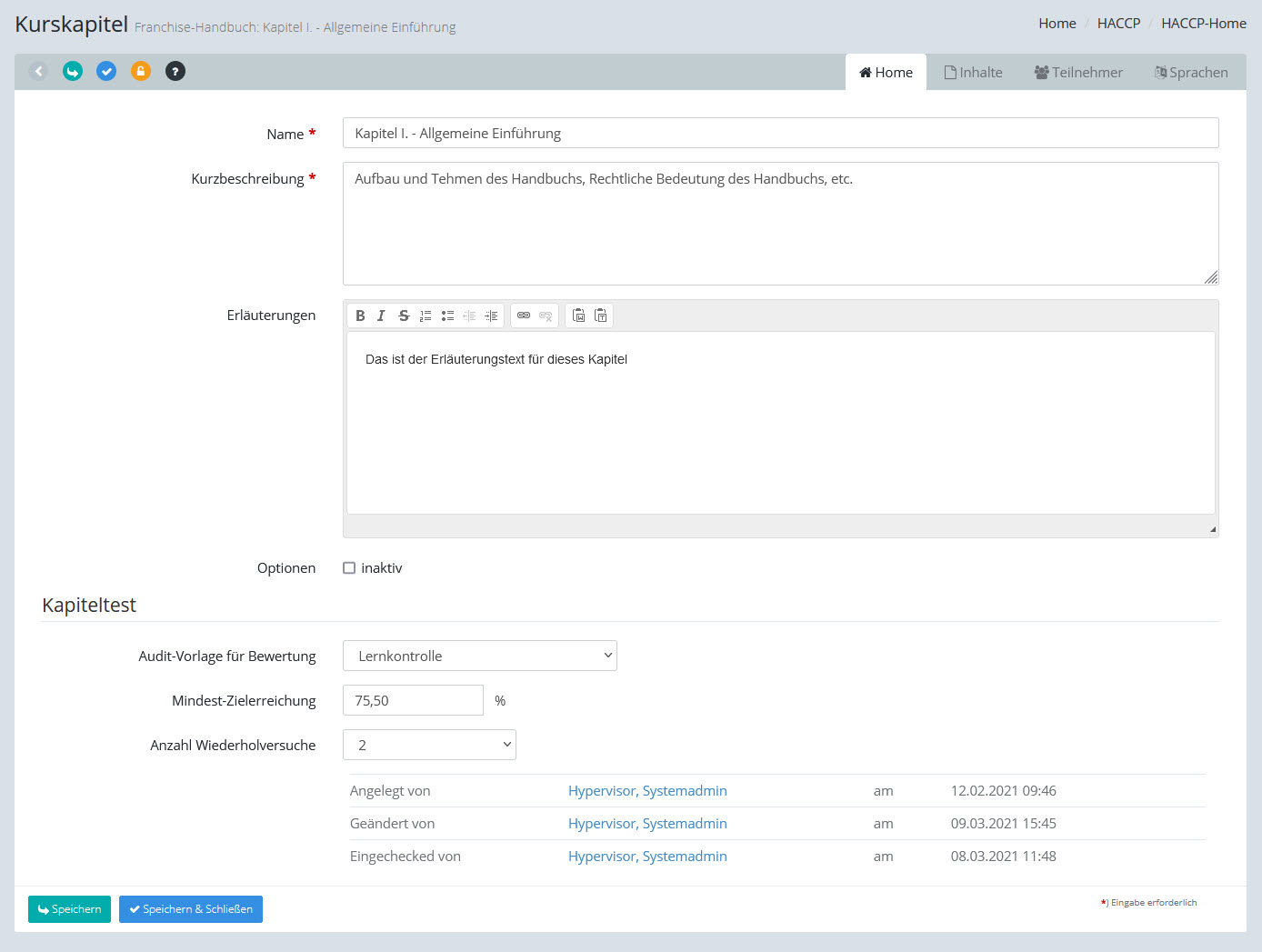Hier können Sie die Stammdaten des Kapitels bearbeiten: