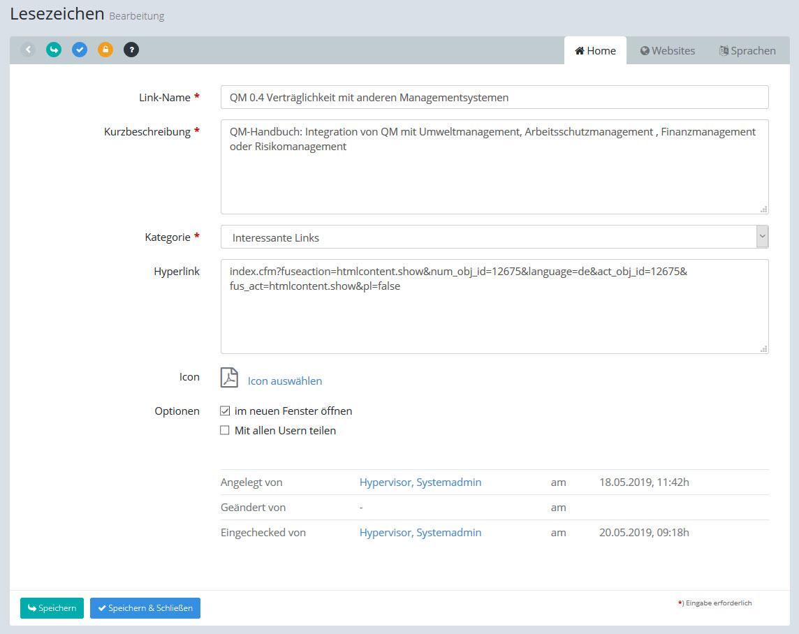 Mit dieser Registerkarte kann ein Administrator das Lesezeichen auf einer Systemplatzierung der Website veröffentlichen, z.B. interne oder externe Links.