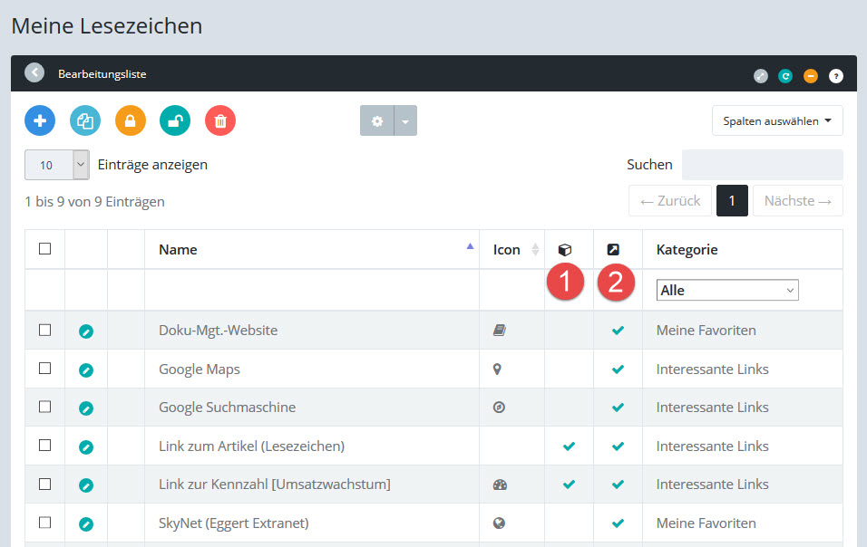 2.Ein Häkchen in dieser Spalte zeigt an, dass sich der Link in einem neuen Fenster öffnet