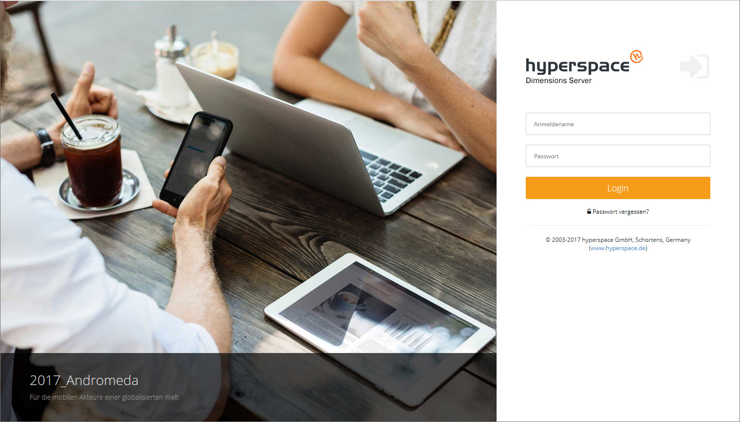 Nach Eingabe der Web-Adresse zu Ihrem hyperspace Dimensions System erscheint der Login-Bildschirm, wenn Sie noch nicht eingeloggt sind: