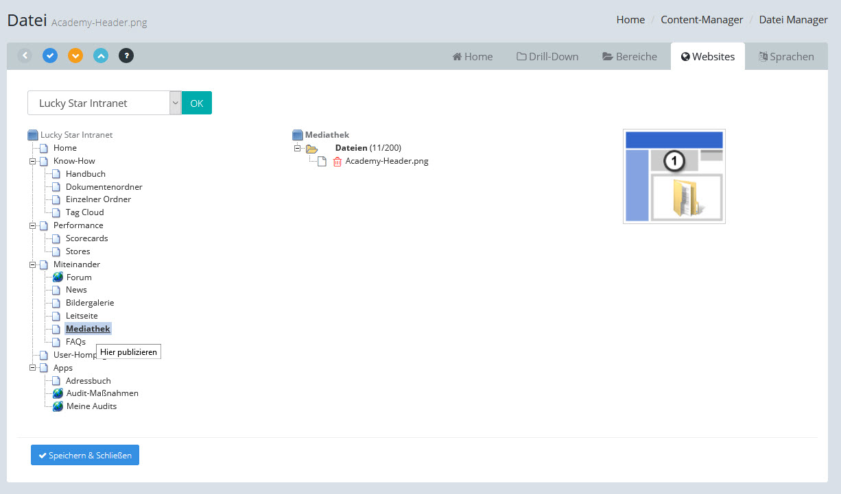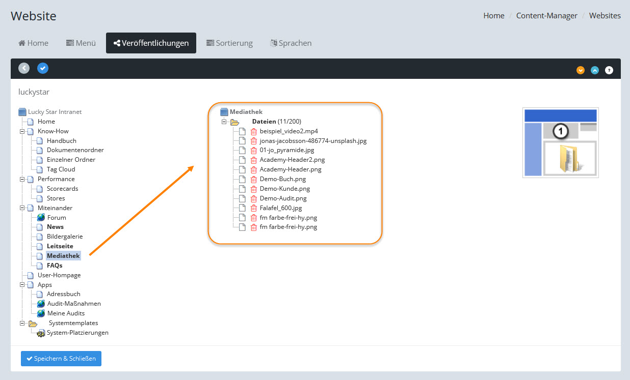 Abhängig von der Einstellung auf der entsprechenden Website im Contentmanager werden in der Mediathek die Dateien entweder mit Hilfe von Ordnern oder über eine direkte Zuordnung der Mediendateien zum Menüpunkt der Website veröffentlicht:
