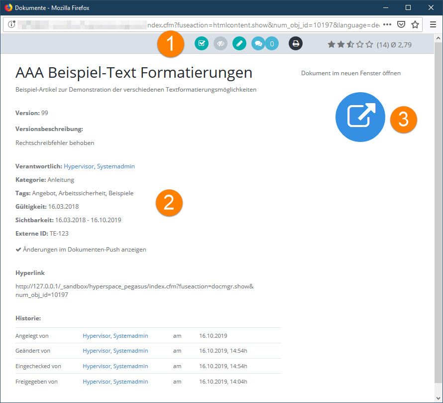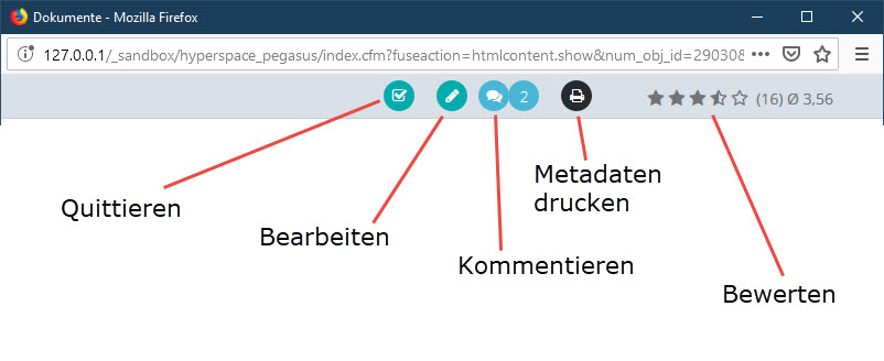 Mit Hilfe der Buttons und Schaltflächen in der Menüleiste (1) können Sie das Dokument quittieren, bearbeiten, kommentieren oder bewerten: