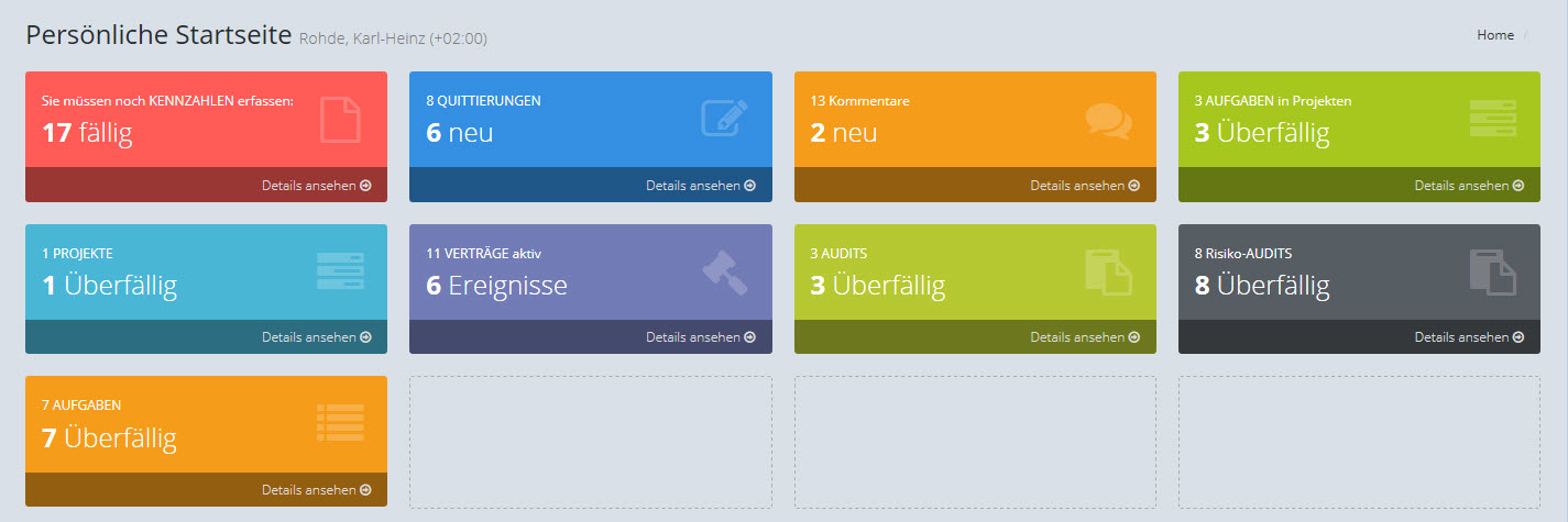 Anordung, Die Anzahl der Info-Kacheln variiert, abhängig davon, welche Softwaremodule lizenziert sind und welche Aufgaben aktuell zu erledigen sind.