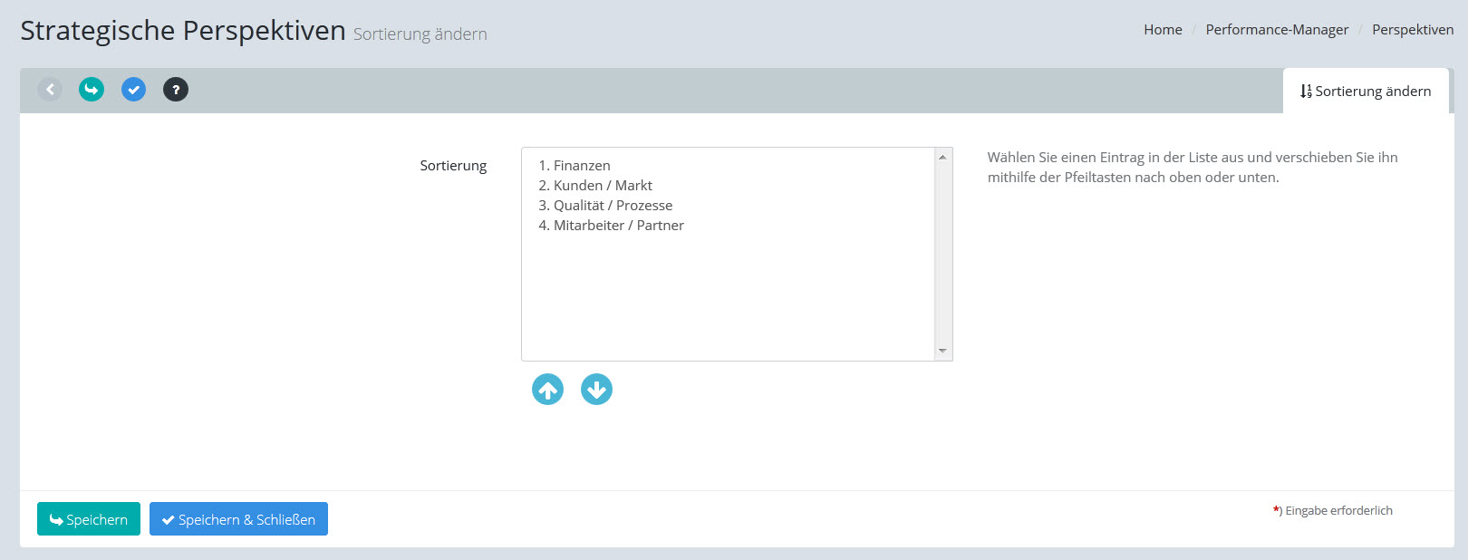 Markieren Sie die Perspektive, deren Reihenfolge Sie verändern wollen und benutzen Sie die Pfeiltasten neben der Liste, um die markierte Perspektive zu verschieben.