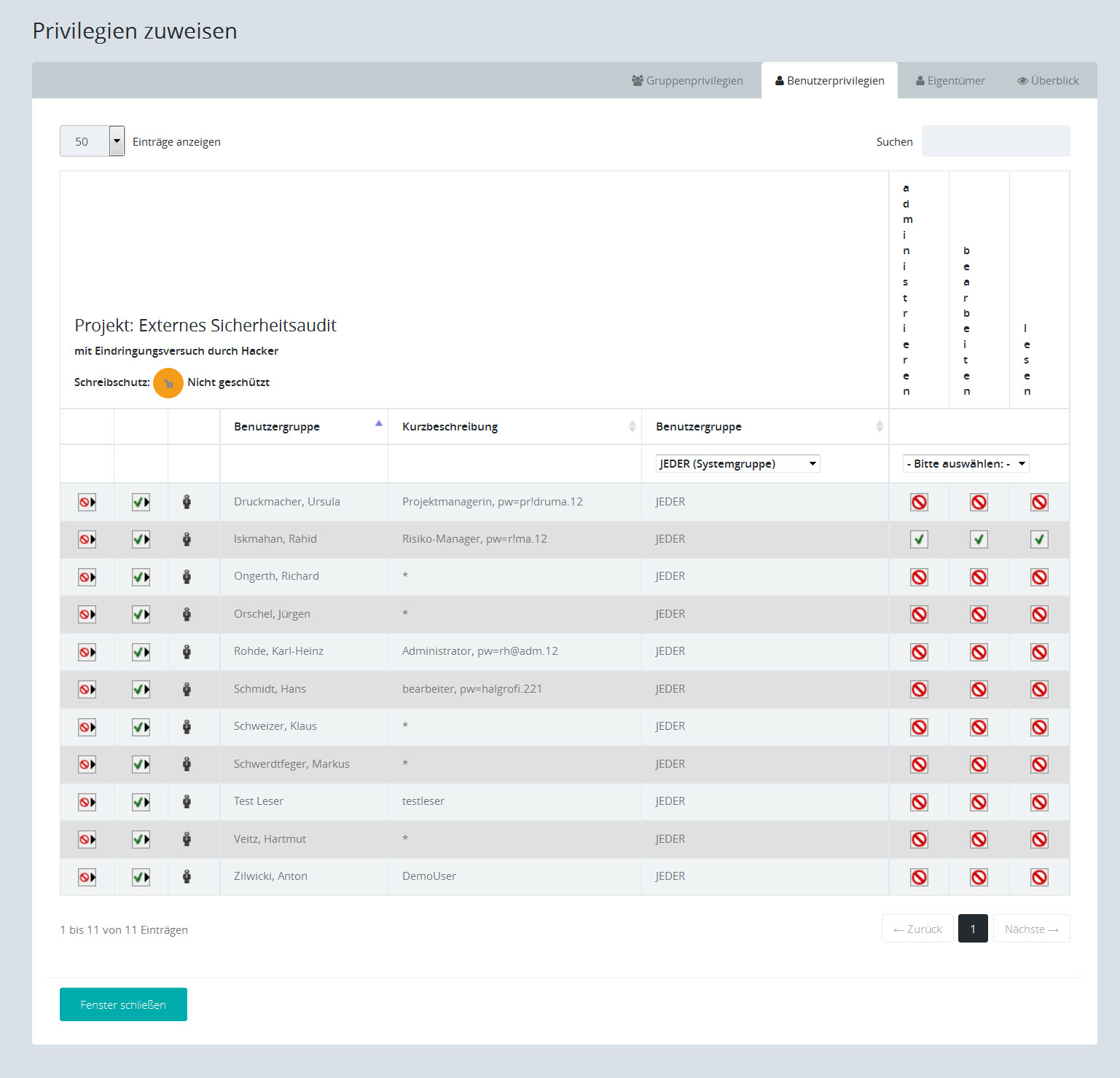 Klicken Sie auf die Symbole in der Liste, um die Berechtigungen zu vergeben oder zu entziehen: