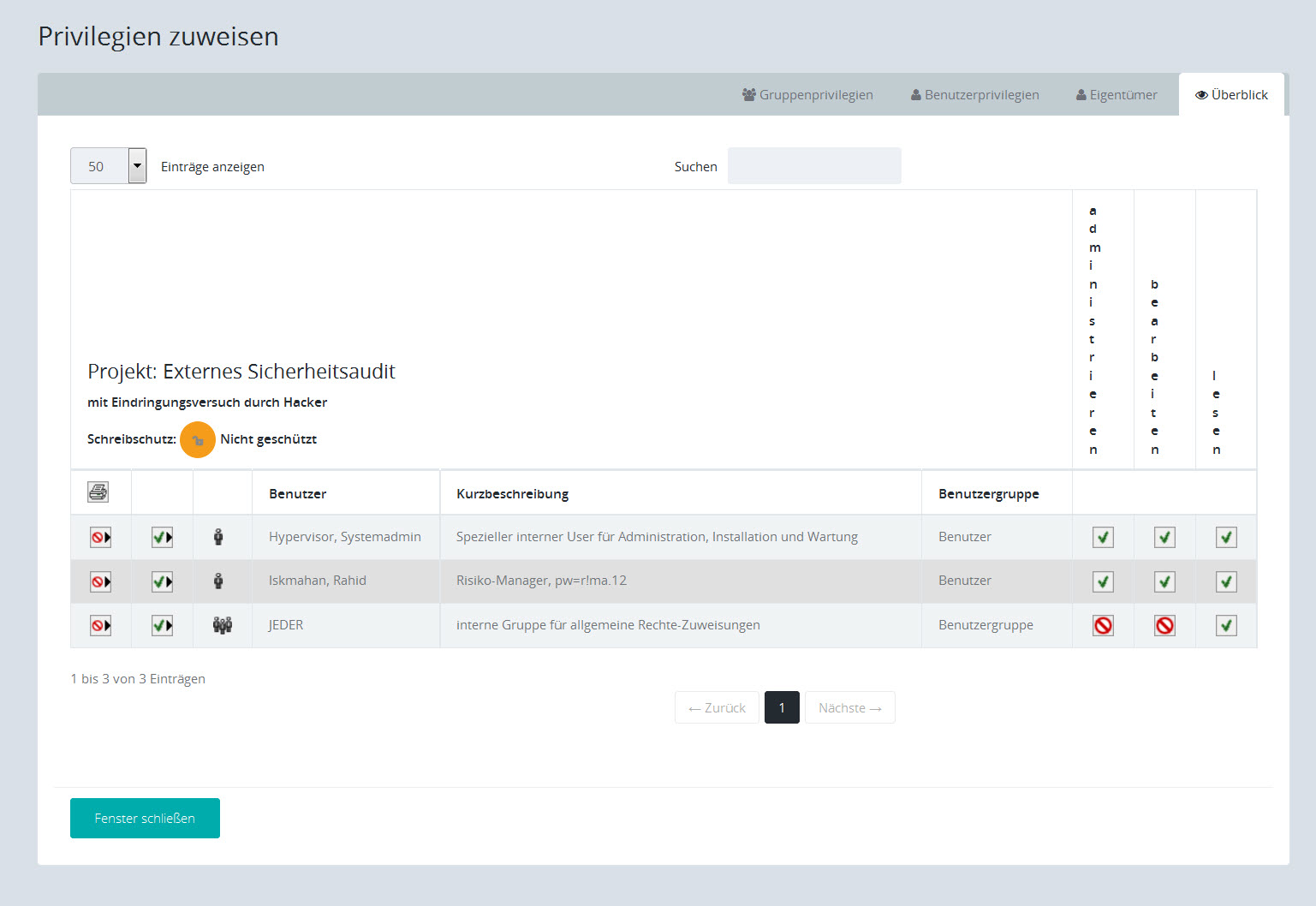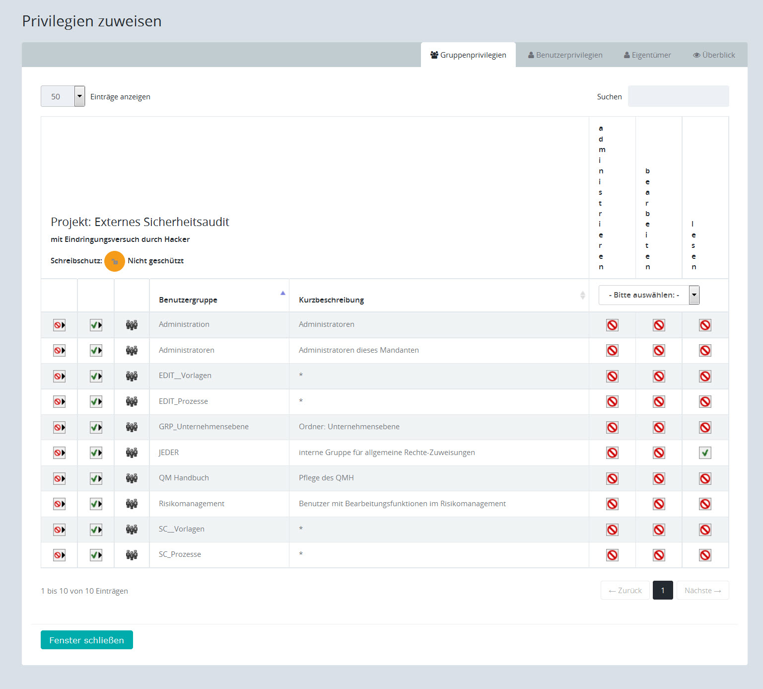 Hinweis: Wenn Sie alle Privilegien eines Benutzers oder eine Benutzergruppe entfernen, verschwindet der Eintrag aus der Liste.