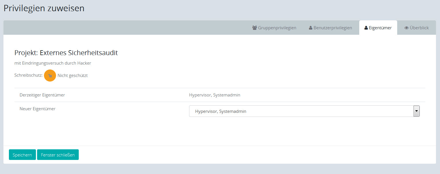 Außerdem können Sie den Eigentümer des Objektes ändern und eine Übersicht der aktuellen Privilegien sehen.