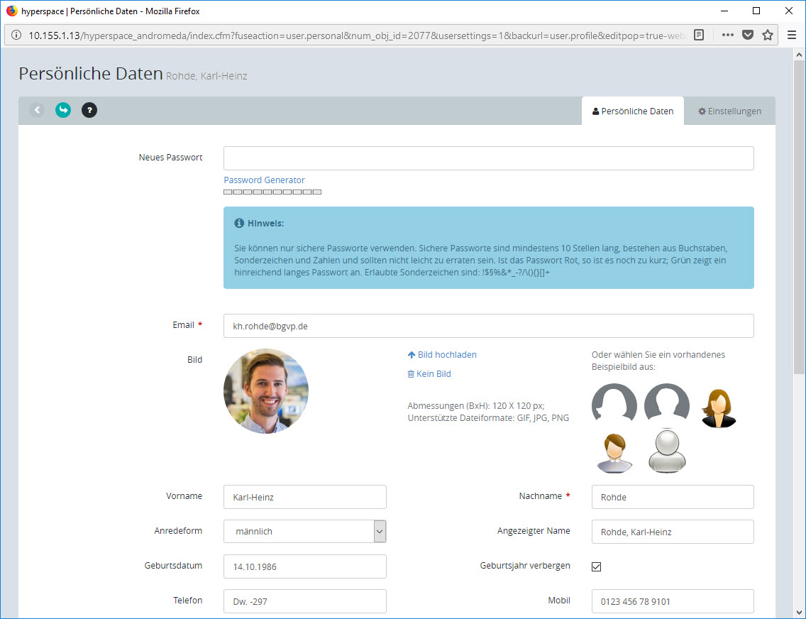 Mit dem Button [Mein Profil bearbeiten] können Sie Ihr Passwort, E-Mail-Signatur oder E-Mail-Adresse, Ihr Profilbild sowie weitere persönliche Einstellungen ändern: