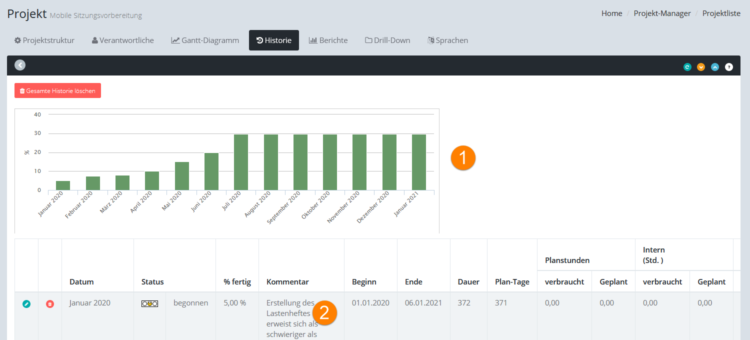 Auf der Registerkarte "Historie" finden Sie Informationen über den Verlauf des Projektes.