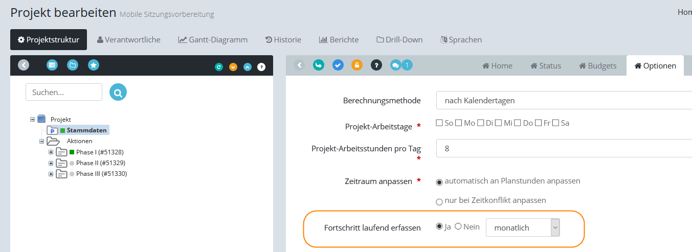 Diese Informationen können bei länger dauernden Projekten vom Projektverantwortlichen einmal im Monat oder einmal im Quartal erfasst werden. Das Erfassungsintervall stellt der Projektverantwortliche bei den Projekteigenschaften auf der Registerkarte "Optionen" ein. Für die Erfassung der Projekthistorie erhält der Projektverantwortliche automatisch eine Erinnerung per Email.