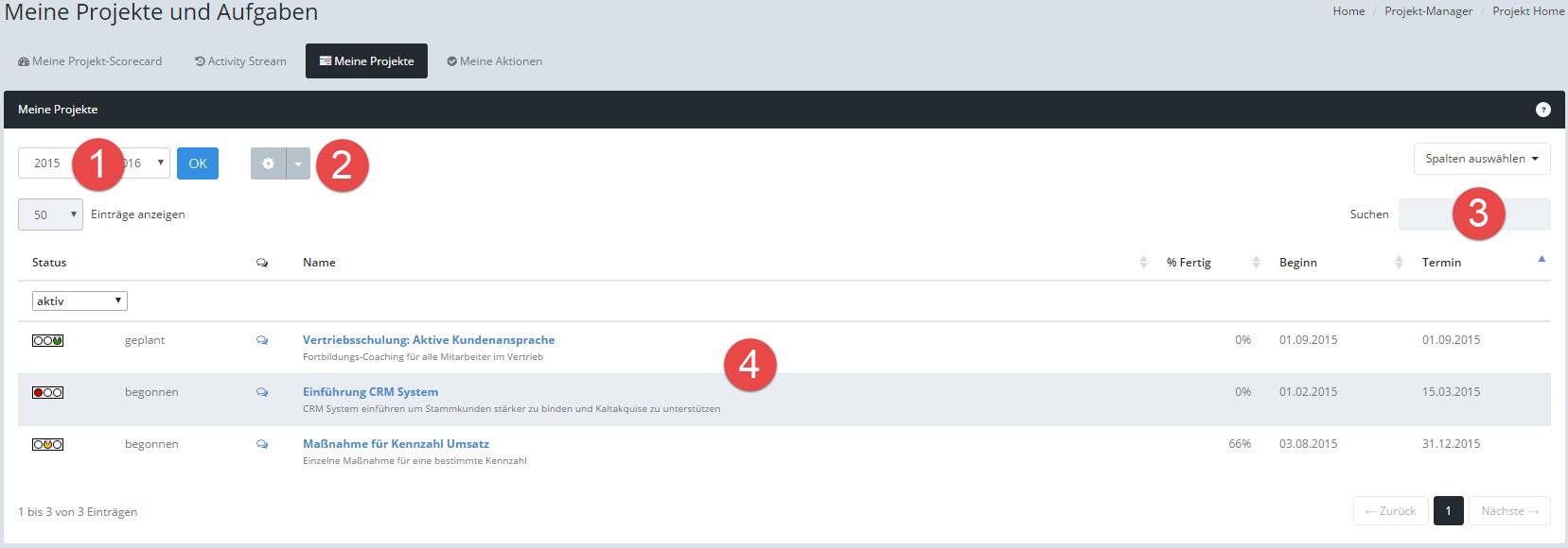 4.Anzeige der Projekte, die Liste kann nach dem Projektstatus (aktiv, abgeschlossen, überfällig, ...) gefiltert und nach allen Spalten sortiert werden.