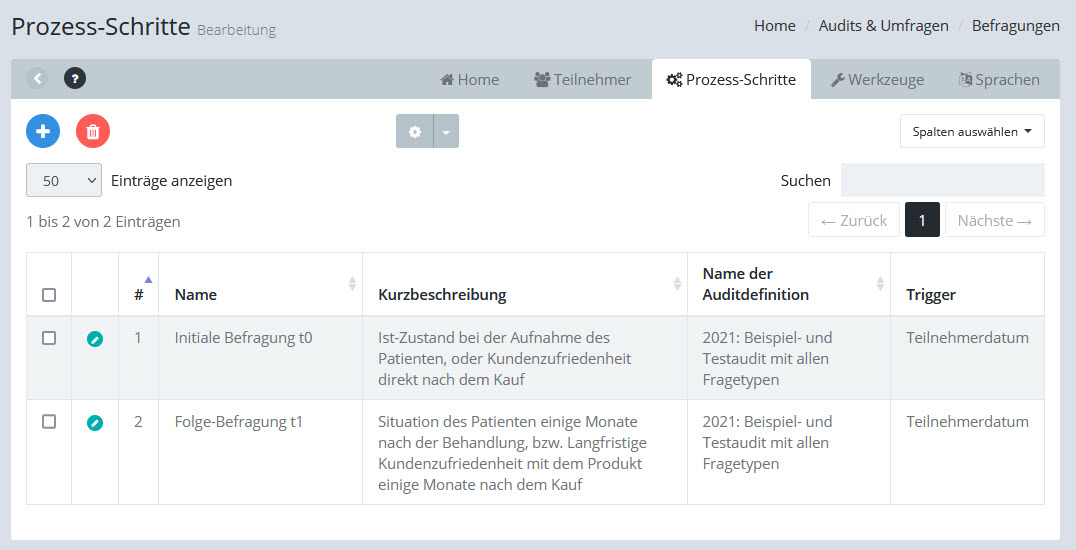 Klicken Sie in der Bearbeitungsliste der Prozess-Schritte auf den blauen (+) Button, um eine neuen Prozess-Schritt anzulegen, oder wählen Sie einen vorhandenen zur Bearbeitung aus.